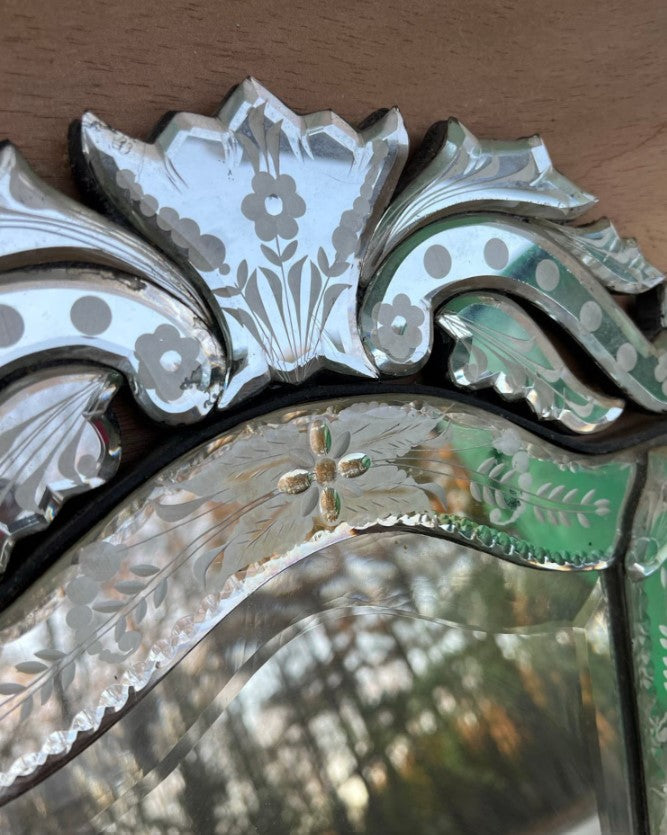 Venetian mirror fine engraved accents, the mirror is in overall good condition, just a darkened area in one of the side sections as shown in the photo, and a usual age spot here and there in the mirror glass.