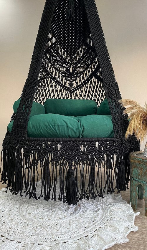 The hanging crochet chair is made in the macrame technique from a hammock 100% cotton macrame cord. This macrame swing will be great bohemian decor for your rustic room.