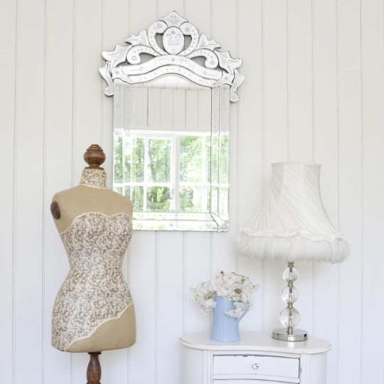 Venetian mirror fine engraved accents, the mirror is in overall good condition, just a darkened area in one of the side sections as shown in the photo, and a usual age spot here and there in the mirror glass.
