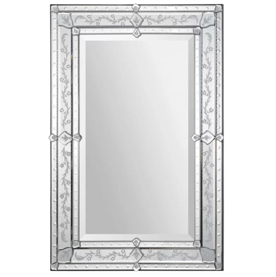 Venetian mirror fine engraved accents, the mirror is in overall good condition, just a darkened area in one of the side sections as shown in the photo, and a usual age spot here and there in the mirror glass.